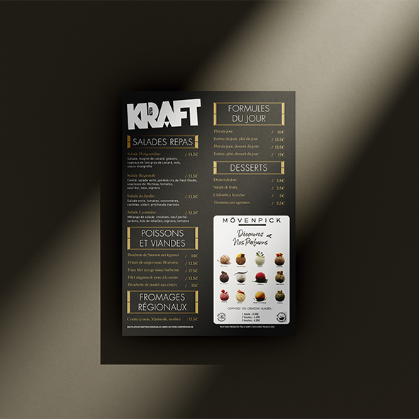 Besançon, France.Suggestion de carte pour le menu de la brasserie, à l’image des lieux et de leur identité visuelle. Mise en page en deux colonnes et travail du contraste entre le fond et les typographies.